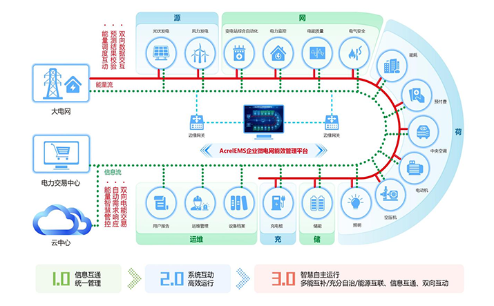 簡介:1.概述 通過在源、網(wǎng)、荷、儲、充的各個關(guān)鍵節(jié)點安裝監(jiān)測、分析、保護、治理裝置, 通過高性能邊緣計算網(wǎng)關(guān)采集數(shù)據(jù)并上傳至企業(yè)微網(wǎng)平臺。平臺根據(jù)新的電網(wǎng)價格、 用電負荷、電網(wǎng)調(diào)度指令等情況,調(diào)整各系統(tǒng)控制策略并遠程下發(fā),使企業(yè)微電網(wǎng)始終高效穩(wěn)定運行, 降低企業(yè)用電成本,實現(xiàn)能源互聯(lián)、信息互動。 2.應(yīng)用場所 適用于各行業(yè)企業(yè)內(nèi)部微電網(wǎng)管理系統(tǒng)的新建、擴建、改建等項目。 3.平臺結(jié)構(gòu) 3.平臺功能 安科瑞AcrelEMS企業(yè)微電網(wǎng)能效管理平臺融合了電力監(jiān)控、電氣安全、照明控制、能源管控、充電樁運營管理、分布式光伏監(jiān)測、儲能管理、設(shè)備臺賬、運維管理等功能,通過一個平臺、一個APP整體的對企業(yè)用電進行集中監(jiān)控、統(tǒng)一調(diào)度、統(tǒng)一運維,并且根據(jù)當?shù)毓╇姴块T錯峰避峰計劃提前為企業(yè)制定錯峰避峰方案和預(yù)警,滿足企業(yè)